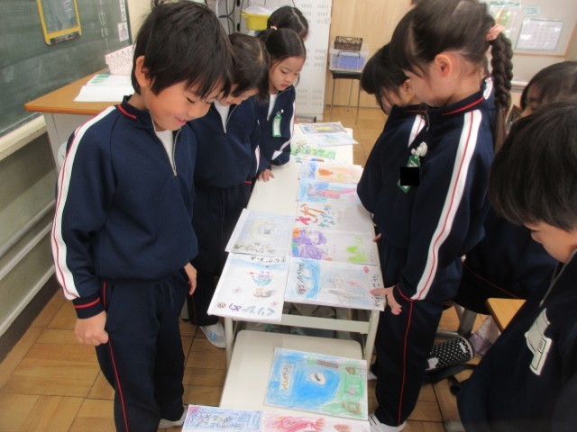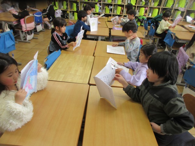 国語では、「おはなしをかこう」の学習をしました。ていねいに表紙の絵を描き、本の形に仕上げました。完成したら、書いたお話を交換して読み合い、感想を伝え合いました。「スイカたろうが敵をやっつけるところが楽しかったよ。」「終わり方が自分の予想とは違っていておもしろかったな。」…子供たちは、自分が書いたお話が友達にも楽しんでもらえてうれしそうにしていました。