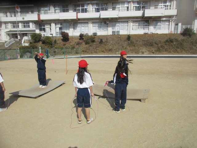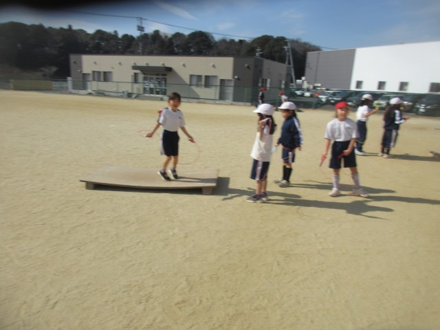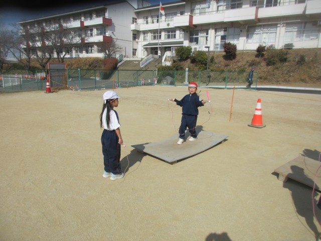 体育の時間には、なわとびの学習を続けています。ジャンプ台が登場してからは、ジャンプ台が大人気です。休み時間にもジャンプ台を使って練習をしている人を多く見かけます。「前は、二重跳びができなかったけど、ジャンプ台で練習したらできるようになったよ。」…うれしそうに報告してくれました。