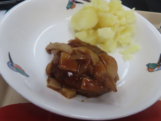 今日の給食です。今日は『ごはん』🍚、『ハンバーグきのこのソースかけ』、『こふき芋』、『オニオンスープ』。