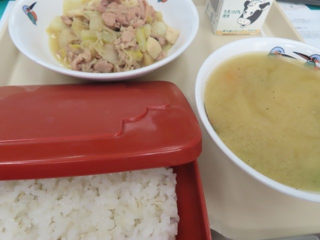 今日の給食です。今日は『ごはん』🍚、『肉豆腐』、『鶏団子汁』。
