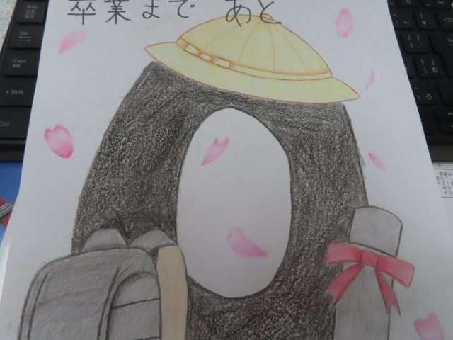※この写真は、6年生の教室のカウントダウンカレンダー。卒業式当日の物を子供たちに頼まれて作成しました。絵は本校の若手事務職員が描いてくれました。とっても上手ですよね。😊この絵の下に私からのメッセージが。