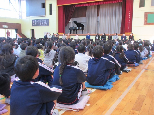 2月19日(木)には、「感謝の会」が行われました。読み聞かせをして下さるフォレストさん、調理員さん、スクールサポートスタッフ、学校の用務員手、どんぐりっこまつりの実行委員さん、スクールパトロールさんに宛てて書いた感謝の手紙をクラスの代表児童が贈呈しました。最後に全校児童で歌った校歌も素晴らしいものでした。いつも、子供たちのためにご尽力いただき、本当にありがとうございます。