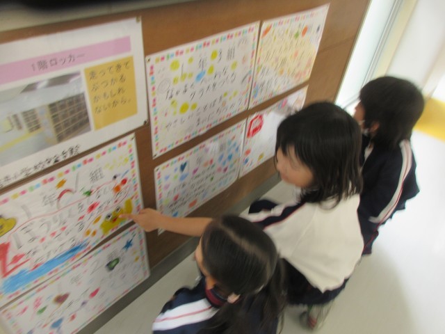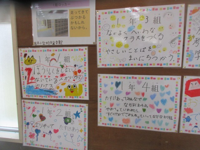 図書室前の廊下に、やさしさいっぱい集会の各クラスのスローガンが掲示されました。「やさしい言葉をいっぱい使う。」など、クラスで話し合いをして決めたスローガンです。「この絵、みんなで描いたよ。なつかしいな。」掲示物を見ながら、笑顔になっていました。