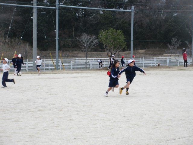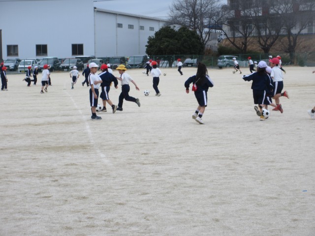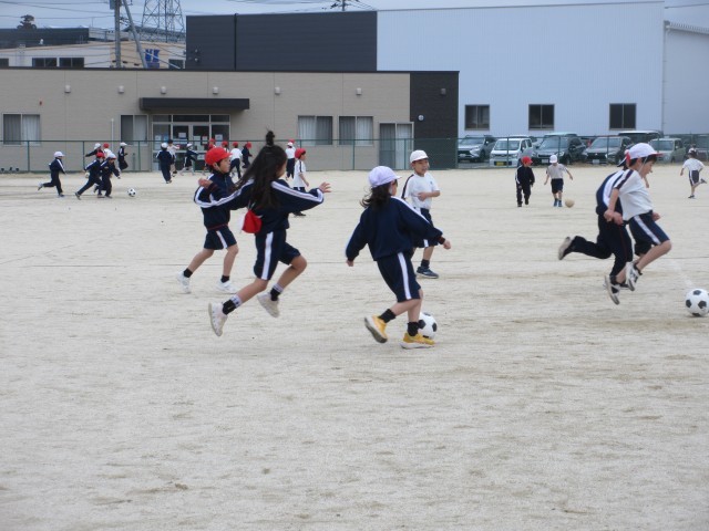 体育では、ボール運動(サッカー)に取り組んでいます。今週は、ドリブル練習、パス練習の他に、2対2の練習もしました。少人数で2チームに分かれて、ボールを取り合うのです。子供たちは、夢中になってボールを追いかけていました。