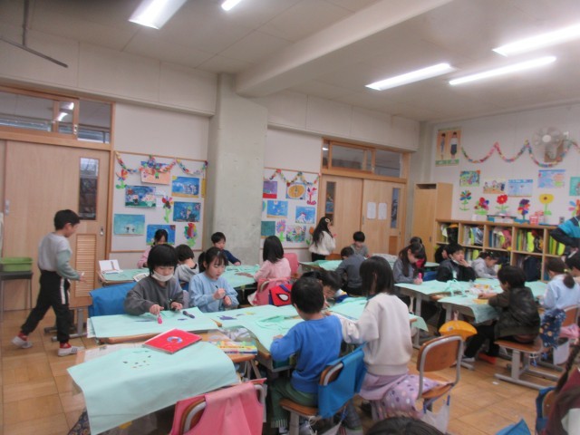 図工では、作品バッグ作りをしました。作品バッグに思い思いに絵を描き、1年間の図工作品をバッグに詰めて、持ち帰りました。「なつかしいなあ。『できたらいいな、こんなこと』の昆虫の絵、すごく一生懸命描いたから、一番心に残っているよ。」…うれしそうに自分おの作品を眺めていました。