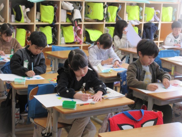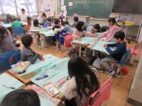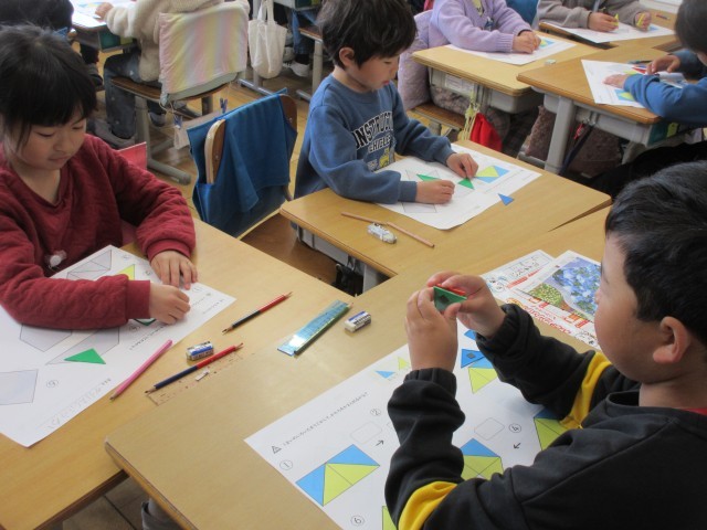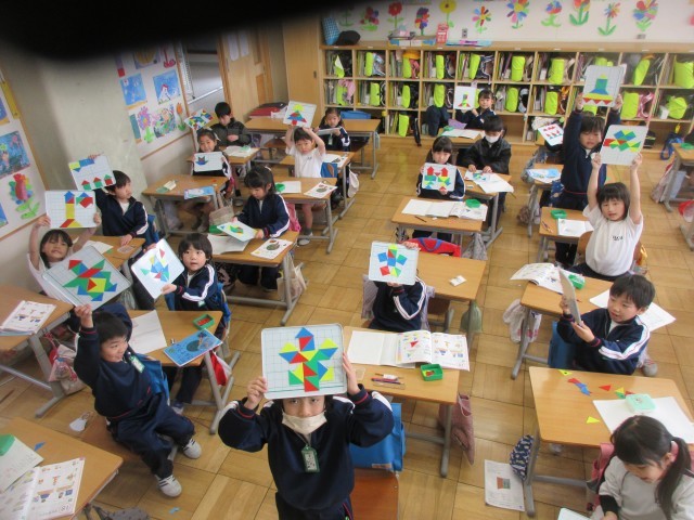 算数では、かたちづくりの学習をしています。色板を並べていろいろな形を作りました。その後は、色板4枚を使ってずらしたり回したりしながらいろいろな形に変える学習を進めました。子供たちは、真剣に考えながら、楽しそうに学習をしていました。