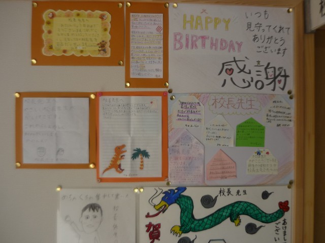 夏休みの工事に伴い、校長室の廊下側に掲示板を作っていただきました。その掲示板には、子供たちからのプレゼントを飾りました。(今後も飾っていきます。)校舎の一番はずれにあるので目立ちませんが、ぜひ、見に来てくださいね。