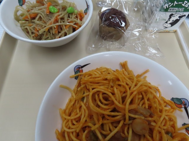 今日は『スパゲッティナポリタン』、『ごぼうサラダ』、『むしパン』。一言。最高!