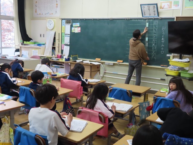 明るく元気いっぱいの1年生。外は寒いですが、教室の中は、子供たちの熱気でムンムン!