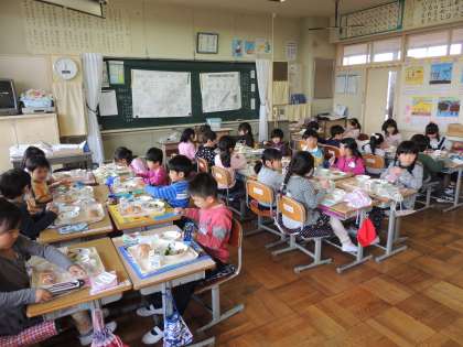 1年生は今日から給食が始まりました。