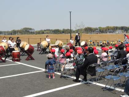 本陣太鼓の演奏では、迫力満点の演技を、とても楽しそうに見学していました。