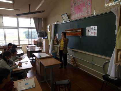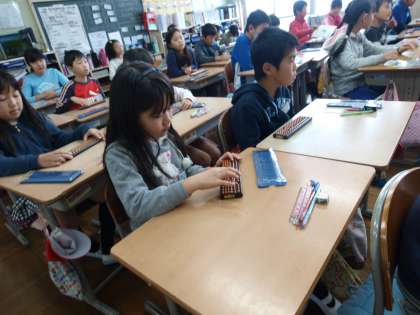 11/5(水)3校時に4年生のそろばんの授業が行われました。3年生で学習してから久しぶりにそろばんに触る児童もいましたが,少し練習するとコツを思い出して素早く計算できる児童もちらほら…。電卓とは違う,昔ながらの道具の便利さを実感した1時間でした。