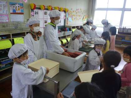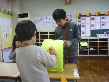 6年生は入学式の日から,1年生の朝の準備,給食,掃除のお手伝いをしてきました。今日は最終日。1年生は,自分でできるようになったことが多くなりました。
