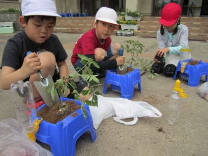 生活科の「花や野菜を育てよう」の学習で,野菜の苗を鉢に植えました。1年生で育てていたチューリップの球根を抜いた後,ミニトマト・キュウリ・ピーマン・ナス・いんげんから好きな苗を選び,自分の鉢に「大きくなあれ!」と気持ちを込めて植えました。野菜の収穫できる日が,今からとても楽しみです。
