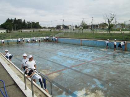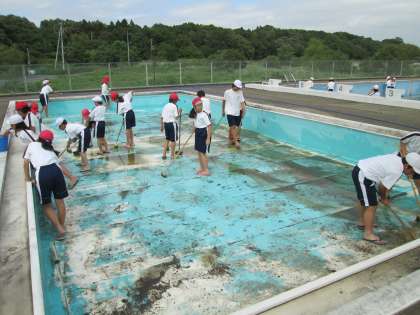 5時間目と6時間目の2時間を使って,プール清掃を行いました。プールの底にたまった泥や藻を子供たちは,一生懸命きれいに掃除してくれました。