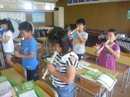今日の音楽は,はじめてソプラノリコーダーを吹きました。まずは,持ち方を覚え,タンギングを意識してトゥートゥーと息を入れながら音出しをしました。息の入れ方に気を使わないと,ピーッと汚い音になってしまいます。お互いの音を聞きながら,少しずつステップアップしていきたいと思います。