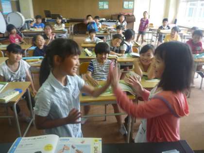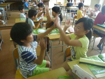 また,「茶つみ」の歌(少し季節は過ぎてしまいましたが)で手遊びをしました。お隣の子とペアになって,♪なつもち〜かづく とリズムに合わせながら手を合わせました。最初は,タイミングがずれて手が外れてしまったり,相手をはたきそうになってしまったりとうまくいきませんでした。それが徐々に調子に乗ってきて,息もぴったり合うようになりました。休み時間も楽しくやっているペアも見られました。