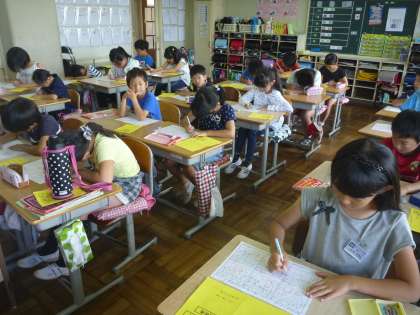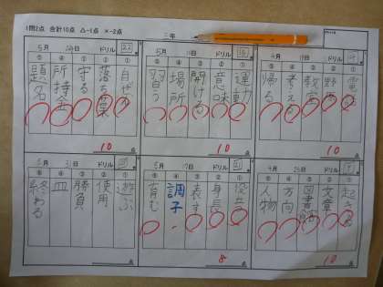 3年 漢字ミニテスト 公開日 2016/05/31 更新日 2016/05/31 3年生の様子 5/31(火) 毎週火曜日の朝自習「あじさいタイム」には,漢字のミニテストをしています。前日に宿題に出された漢字ドリルの中から5問出題します。漢字の習得を促す効果はもちろんですが,朝の10分間,集中して取り組むことで脳の活性化も期待できます。目指せ満点!