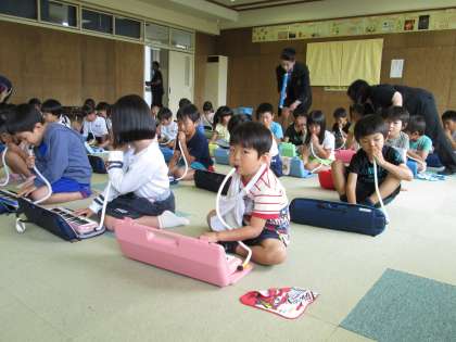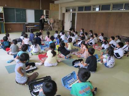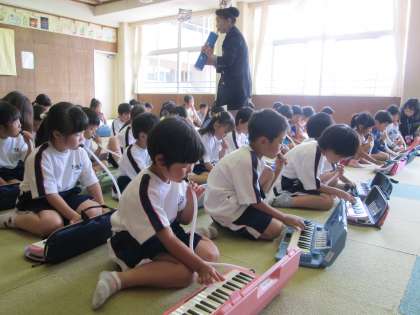 1年生の音楽の授業では,外部講師を招いて鍵盤ハーモニカの講習会を行いました。子供たちは,鍵盤ハーモニカを使ってきれいな音の出し方を教えてもらいました。