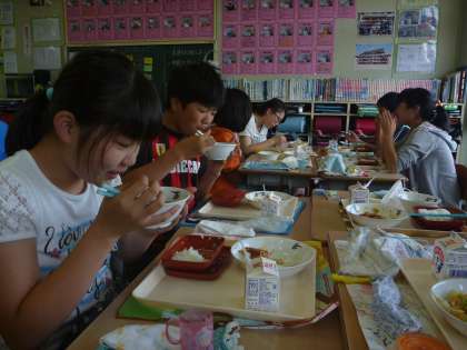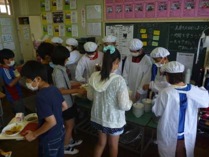 6年 カミカミデー 公開日 2016/06/03 更新日 2016/06/03 6年生の様子 6/2(木) 今日は,週1回の和食の日。「カミカミデー」でした。高井小学校では6月の給食指導のめあてを,「よくかんで食べよう」と「牛乳について知ろう」としました。一口30回かんで食べるよう放送が流れ,意識しながら魚を食べていました。 また,残飯を少なくしようと,今クラスでは取り組んでします。一人一人の意識を高くして残飯を減らし,調理員さんに喜んでもらいたいです。