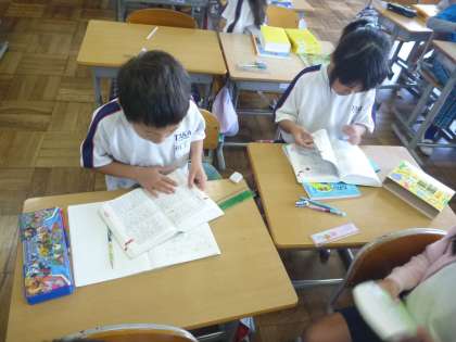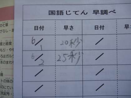 3年 熱中! 国語辞典 早調べ 公開日 2016/06/03 更新日 2016/06/03 3年生の様子 6/3(金) 国語で,国語辞典の使い方について学習しました。国語の時間は,マイ国語辞典を手元に置いていつでも調べられるようにしています。今は,国語辞典早調べ大会を授業はじめの3分間で行っています。私の言った単語を一斉に調べ始め,見つけると立って秒数を記録します。慣れてきたので,早い子は15秒ぐらいで見つけます。120秒でタイムアウト。時間内に見つけられるように奮闘中です。
