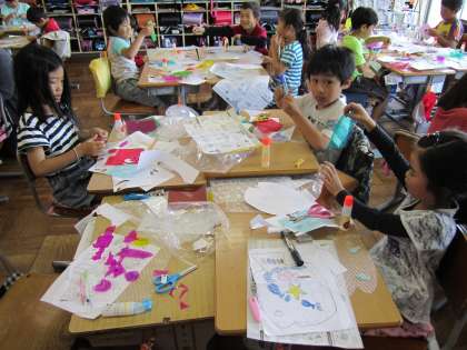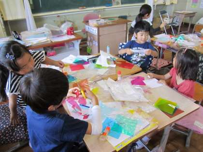 先週に学習した「ひかりのプレゼント」を使って,作品を作り始めました。透明なプチプチを台紙に,カラーセロハンを切り貼りしました。下書きを元に,みんな一生懸命ハサミでカラーセロハンを切っていました。どんな作品が出来上がるのか,とても楽しみです。