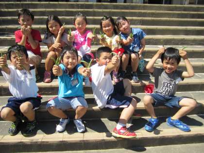 ついに,野菜の収穫・・・第一号!!インゲンの長さは,みんなの指の長さよりも長くなり,無事に収穫をすることができました。「インゲンとったどぉー!」と大喜びで収穫をしていました。