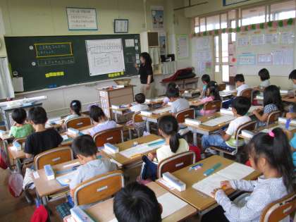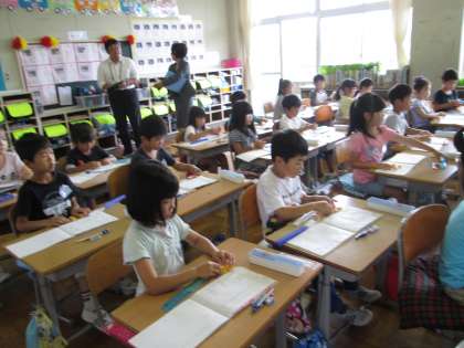 算数の授業では,「あわせていくつ ふえるといくつ」を学習しました。今日の課題は,水槽に5匹金魚がいてその後2匹増やすと全部で何匹(いくつ)になるかを考えました。子供たちは,ブロックを活用しながら全部の数を理解しました。