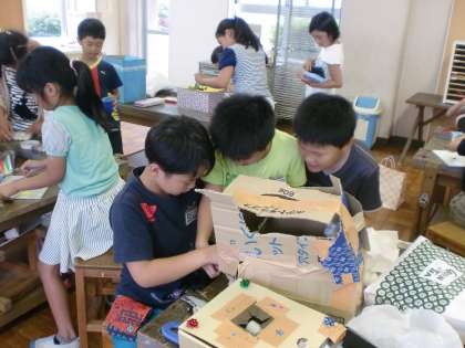 図工の学習で,段ボールを使って「アイデアボックス」を作りました。緻密な作品からダイナミックな作品まで,一人一人が工夫を凝らして制作しました。24日(金)の参観日に展示しますので,お楽しみに。