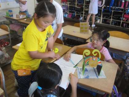 図工の作品をお互いに見合いました。友達の作品の良さを味わいました。