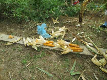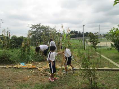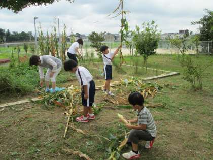 つくし学級では、1学期から菜園でミニトマト,枝豆,サツマイモ,トウモロコシを育てています。今日は,トウモロコシの収穫を行いました。トウモロコシを乾燥させポップコーンを作る予定です。