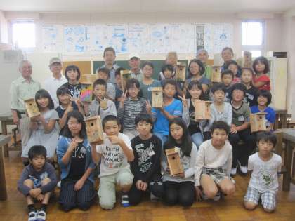 シジュウカラ用の巣箱で、四苦八苦しながら作りました。最初はおそるおそる釘を打っていましたが、なれてくるとしっかりと打つことができ、いい音が響くようになりましたた。できあがった巣箱をうれしそうに見ていました。サインを入れたり、絵を描いたりして最後に仕上げました。二人一組で作ったので、相談して一人の子が持って帰りました。うまくシジュウカラが来てくれるとうれしいです。