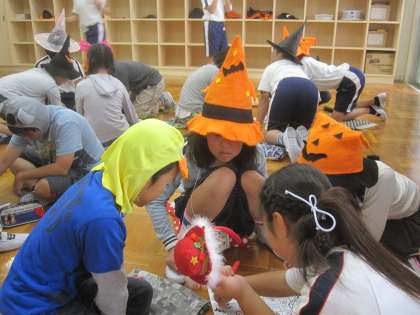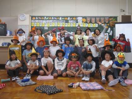 英語の時間にハロウィンの仮装で楽しくすごろくをしました。魔女やジャックオーランタンなどの単語乃描かれているすごろくで、途中いろいろなジェスチャーも入っていてみんなで楽しんでいました。