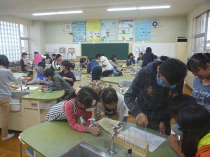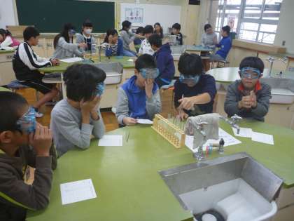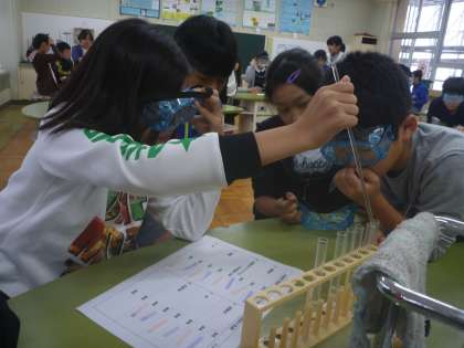 6年 理科【水よう液の性質】 公開日 2016/10/25 更新日 2016/10/25 6年生の様子 10/25(火) 理科室で,「水よう液の性質」の学習を行いました。7つの水よう液を,リトマス紙を使って酸性・中性・アルカリ性の3つに分けました。安全に気を付けながら,みんながガラス棒で実験できるようにしました。