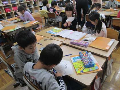今日の生活科は,町探検で調べたことを絵地図にまとめる学習を行いました。