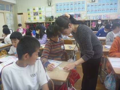 「1食分の献立を考えよう」ということで,何をを考えながら給食の献立を考えているか,などについて話をしてくれました。子供たちはこの後,調理実習の献立を考えます。いろどり,栄養バランス等に気を付けながらグループで今後考えていきます。