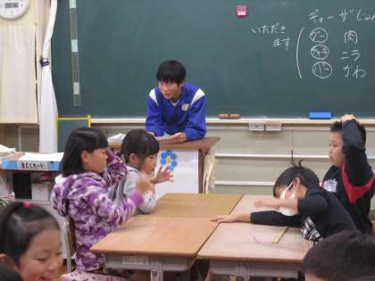 中学生の職場体験では,中学生に丸付けをしてもらったり,九九を聞いてもらったりしました。また,学級活動の時間に「ドーナツをねらえ」ゲームを教えてもらい,みんなで楽しく遊ぶことができました。