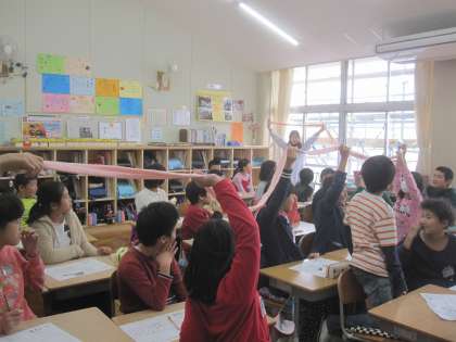 手作りの腸の模型を見て,その長さにびっくりしたり、排便の大切さを感じたり、1時間、食への関心を高めることができました。
