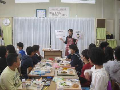 その後、給食の時間に食べるときの姿勢やマナーのお話をきき、いっしょに給食を食べました。