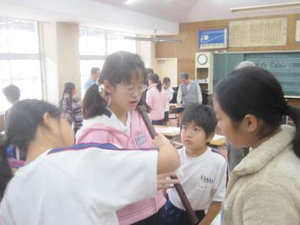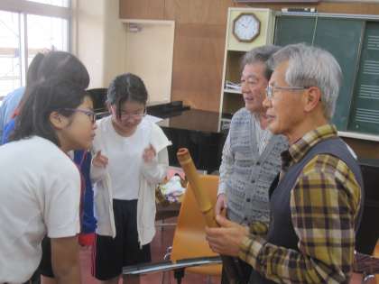音楽の時間に竹友会の方が見えて、尺八の演奏を聴かせてくださいました。尺八の演奏の特徴や独特の楽譜なども教えてもらい、子供たちも驚いてみていました。最後には、尺八に触れたり、吹いてみる時間もあり、吹き方のコツを教えてもらいました。なかなか音が出ないで、難しさを実感していましたが、貴重な体験ができました。