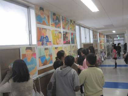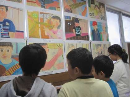 図工の時間に描いた「友達の絵」をみんなで見合いました。4年生と6年生の作品もあったので、いっしょに鑑賞させてもらいました。
