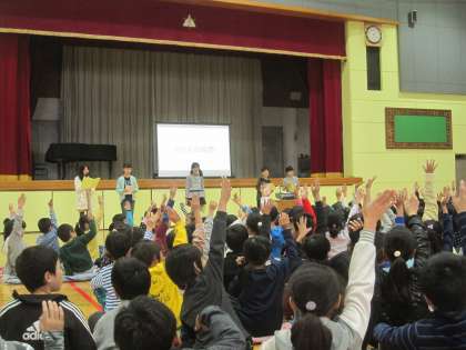昼には、読書集会があり、図書委員の4名が活躍しました。ぐりとぐらの絵本の読み聞かせとクイズを出してくれました。