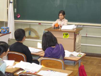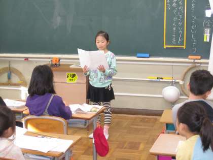 学校や町の身の回りにいる名人の中から,紹介したい名人について発表しました。まず,紹介したい名人のことを詳しく思い出し,メモにまとめました。次に,名人紹介カードに,はじめ・中・おわりの形式で,聞く人に分かりやすいように文章を考えてまとめました。最後に,みんなの前で発表し合い,感想や質問を伝え合いました。名人の名前を聞くとみんなビックリしたり,驚いた表情を見せたりして楽しい発表会になりました。