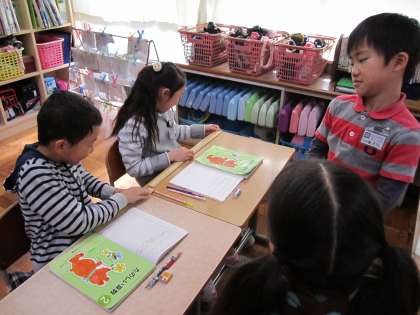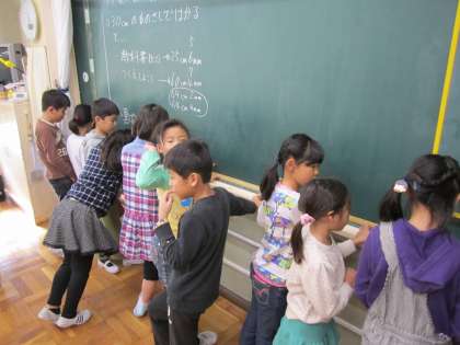 「30cmものさし」を使った算数の学習を行いました。教科書の縦の長さ,机の横の長さ,黒板の横の長さなど測るものが長くなると,「30cmものさし」がたくさん必要になり,大変なことが分かりました。そこで,測るのに長い「ものさし」が必要になるので,1m(メートル)の単位を学習しました。明日は,「1mものさし」を使った学習を行います。