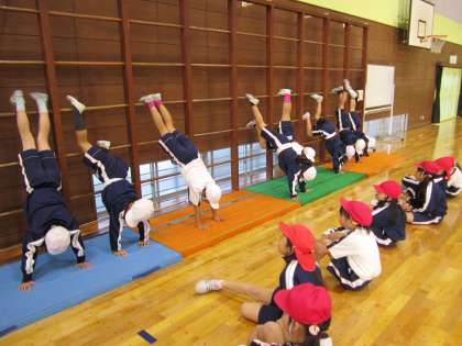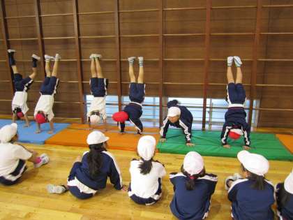 体育の学習では,カエルのにらめっこやアザラシ,前転や後転などの練習を行いました。だんだんコツをつかみ,自信をもって演技するようになってきました。また,今日の最後の練習は,マットを肋木まで移動して壁のぼりさか立ちを行いました。みんな初めての技に夢中になり,意欲的に取り組む姿が見られました。