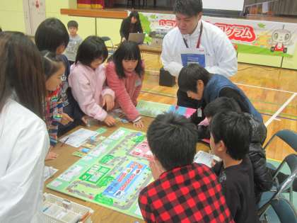 自動車がどのように作られているのか、環境にやさしい自動車の開発などについて映像を見たり、ボードゲームで遊んだりしながら学びました。