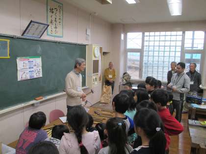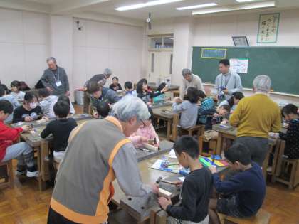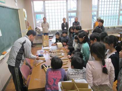 5・6時間目の授業は,図工です。今日の学習内容は,「釘打ちの練習」です。環境NPOとりでの方々が子供たちに釘打ちの指導をしてくれました。