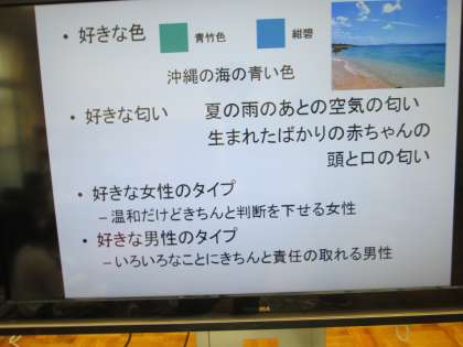 講師の鈴木先生の授業では,「自分の好きを知ろう」をテーマに学習をしました。自分の好きな色,好きな匂い,好きな食べ物,好きなスポーツ,好きな人のタイプetc...