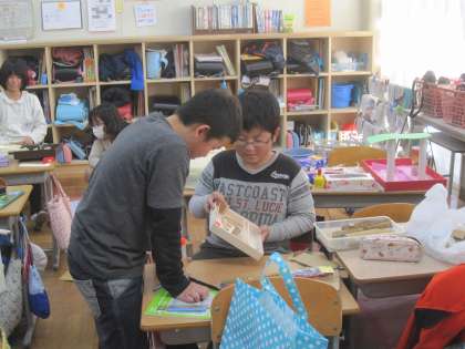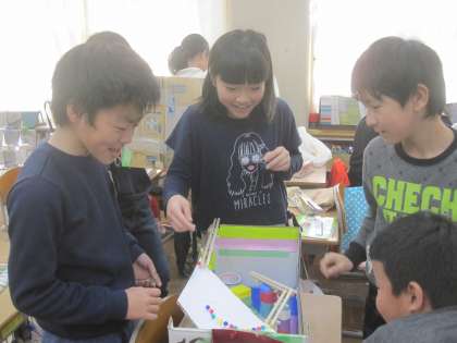 図工で作った「ビー玉の大冒険」。できあがったゲームを見せ合い、遊び方を教えてもらって遊びました。友達の工夫に感心しながら,よいところや面白いところをほめ合って、楽しく遊んでいました。