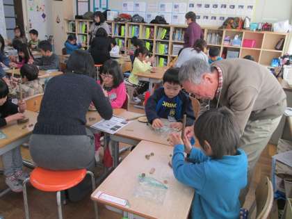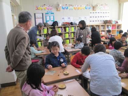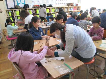 今日の図工の授業は,「いもむしを作ろう」です。ドングリの帽子(殻斗)を使って,キリで穴をあけてつないでいきます。今日は環境NPOとりでの方々が学習ボランティアとして子供たちに指導してくれました。また保護者の方もお手伝いをしてくれました。子供たちは,楽しく活動することができました。